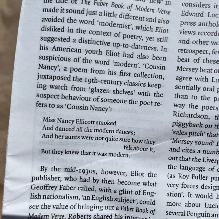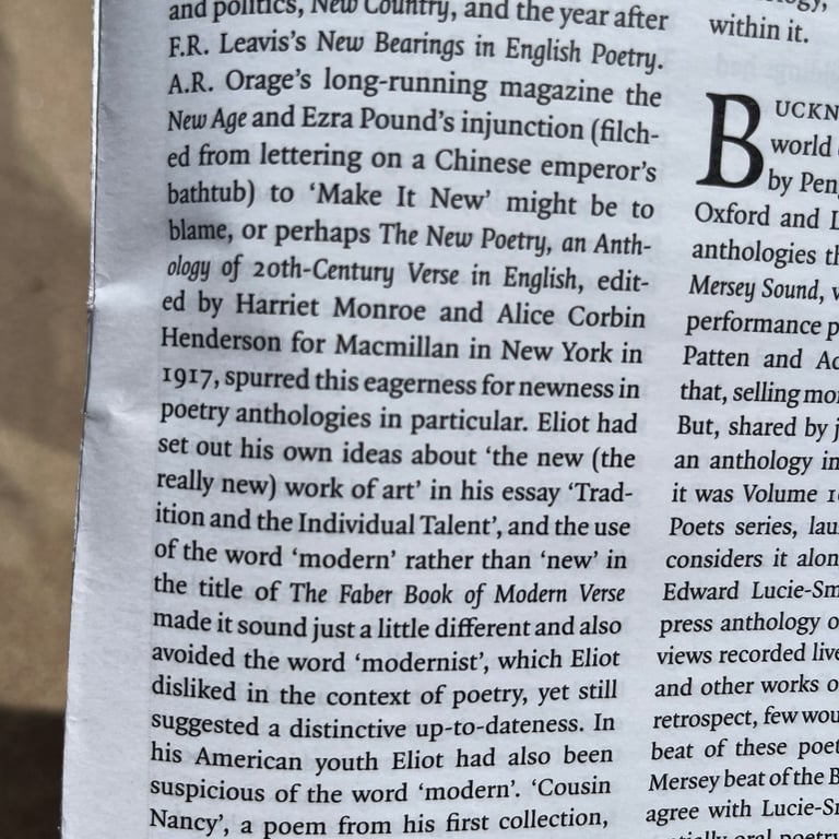 Eliot had set out his own ideas about 'the new (the really new) work of art' in his essay 'Trad-ition and the Individual Talent', and the use of the word 'modern' rather than 'new' in the title of The Faber Book of Modern Verse made it sound just a little different and also avoided the word 'modernist', which Eliot disliked in the context of poetry, yet still suggested a distinctive up-to-dateness