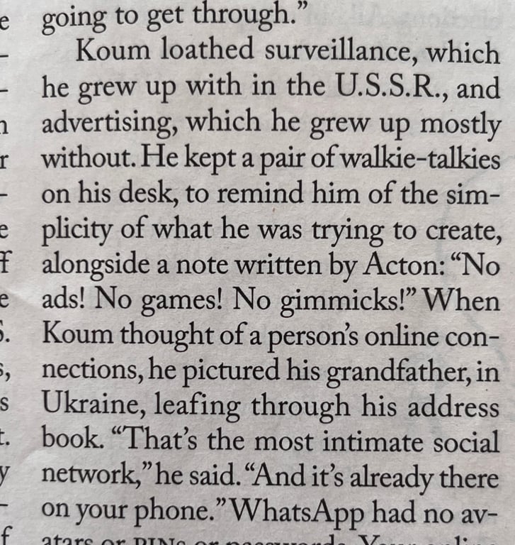 - he grew up with in the U.S.S.R., and advertising, which he grew up mostly without. He kept a pair of walkie-talkies on his desk, to remind him of the simplicity of what he was trying to create, alongside a note written by Acton: "No ads! No games! No gimmicks!" When Koum thought of a person's online con-nections, he pictured his grandfather, in Ukraine, leafing through his address . book. "That's the most intimate social network,"he said. "And it's already there on your phone."
